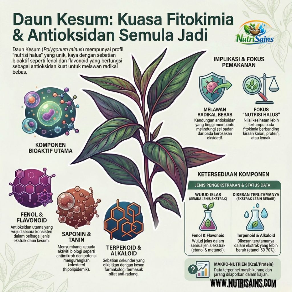 Dalam dunia pemakanan, kita selalu dengar pasal kalori, protein, atau lemak. Tapi untuk daun kesum, pakar lebih berminat dengan “Nutrisi Halus”. Nilai kesihatannya bukan datang daripada makronutrien (sebab data makronutrien dia pun sebenarnya masih terhad dalam kajian), tetapi lebih kepada fitokimia yang terkandung di dalamnya.
