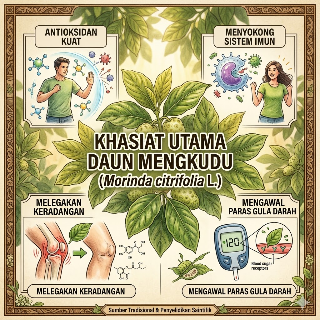 Daun mengkudu (Morinda citrifolia L.) merupakan salah satu bahagian tumbuhan noni yang semakin mendapat perhatian dalam penyelidikan farmakologi kerana kandungan bioaktifnya yang pelbagai. Kajian semasa menunjukkan bahawa daun mengkudu mengandungi flavonoid, tanin, triterpenoid, alkaloid, saponin, sterol, terpenoid, fenolik dan iridoid yang berkait dengan aktiviti antioksidan, antimikrob, anti-radang, antidiabetik dan penyembuhan luka. Walaupun penggunaan tradisional daun mengkudu telah lama diamalkan untuk masalah kulit, keradangan dan sebagai “pembersih darah”, bukti saintifik moden masih banyak tertumpu pada kajian in vitro dan model haiwan. Artikel ini meninjau secara akademik kandungan fitokimia daun mengkudu, potensi farmakologi utamanya, mekanisme yang dicadangkan, batasan bukti saintifik semasa dan pertimbangan keselamatan penggunaannya.