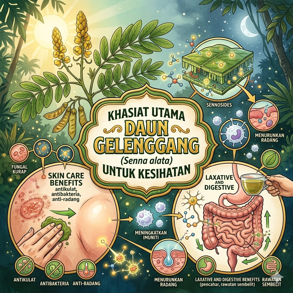 • Ulasan fitofarmakologi melaporkan potensi anti‑oksidan, anti‑radang, antidiabetik, anti‑kanser, antilipogenik dan anti‑hiperlipidemik pada Cassia/Senna alata, terutamanya dari daun, tetapi kebanyakannya masih tahap makmal/haiwan, belum klinikal manusia (Fatmawati et al., 2020; R et al., 2022; Bunya & Lihan, 2022).
