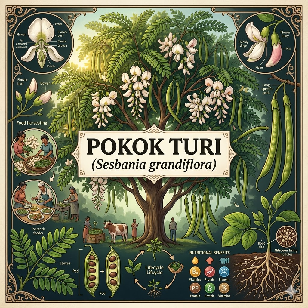 Keyword: pokok turi, Sesbania grandiflora, khasiat pokok turi, kegunaan pokok turi, fitokimia pokok turi, tumbuhan legum tropika, aktiviti antioksidan, perubatan tradisional, bioindustri tumbuhan, nilai pemakanan pokok turi