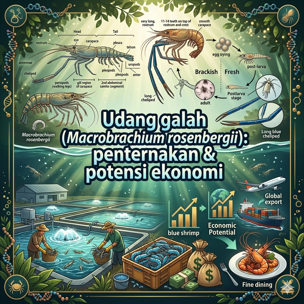 • Udang galah ialah palaemonid terbesar (hingga ~32 cm), tersebar luas di Indo-Pasifik dan jadi sumber protein penting dengan permintaan pasaran tinggi dan harga menarik (Tan & Wang, 2022; Banu & Christianus, 2016).